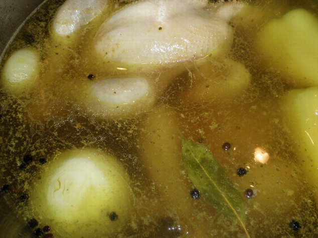 A kakaspörkölthöz a tyúk úgy keveredett, hogy a kakas előtt két nappal tyúkhúslevest készítettem két darab cseh gyártmányú kistestű tyúk felhasználásával. A cseh tyúkokat csekély összegért az egyik hipermarketben vásároltam, s hazavitelük után, még aznap este el is készítettem őket. Feledékenységből leveszöldséget nem vásároltam, s itthon sem volt, így a tyúkok fűszeres, hagymás, fokhagymás, paprikás lében főttek meg, amit eddig még soha nem követtem el. (A zöldség hiányát magamban azzal indokoltam, hogy így majd biztosabban meg tudom ítélni a cseh madárkák minőségét.)