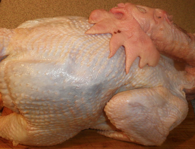A kakas egy ideje már Gábor hűtőszekrényében pihent, várva a nagy találkozást. Társa, egy másik madár már korábban bográcsban végezte. Gábor készítette el, s Tomoko segített neki. Hallomásból tudom, hogy jól sikerült (a főzés előtt konzíliumot tartottunk, s sorra vettük az állat elkészítésének különböző módozatait). A rám váró madár, miután dermedt fagyosságából felengedett, így nézett ki: