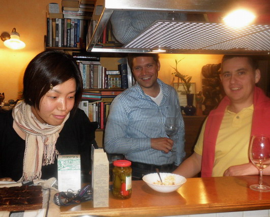 A kakaspörkölt főzés Tomoko (japán gasztroblogger), András és Gábor (kakastulajdonos) jelenlétében zajlott. (Szilvia és Edina később érkeztek.)