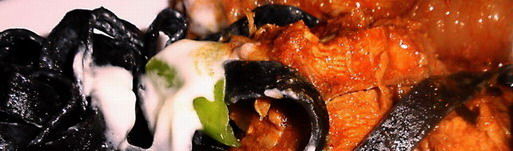 A tintahal valójában egy tintahal fekete festékével festett tészta volt, amit eredetileg túrós tésztához gondoltam volna felhasználni a fekete és fehér kontrasztja miatt, de végül az előző este másnapján a kakaspörkölt maradékához társult, s igazán jó volt együtt a két étel.