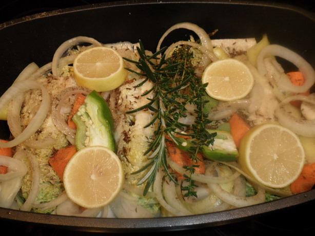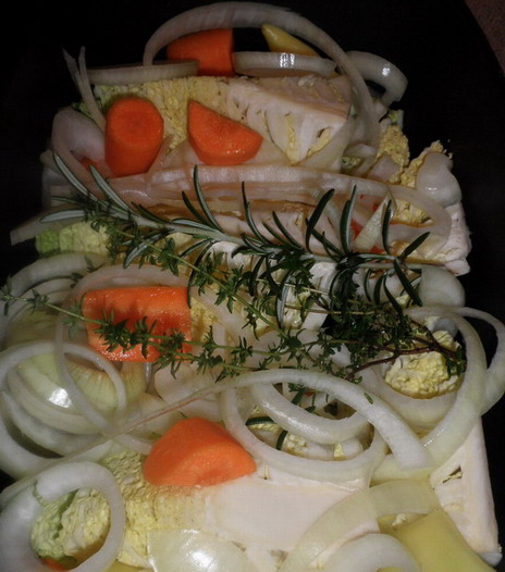 A zöldségeket először lefedve pároltam, dinszteltem, majd előmelegített, 220°C hőmérsékletű sütőben tovább főztem, sütöttem. Az így elkészített zöldségeket tejföllel, sajttal ettem. A maradék káposzta aztán másnap némi zöldborsós rizottó (Risi e bisi) társaságában lett S.Gábor vega eledele.