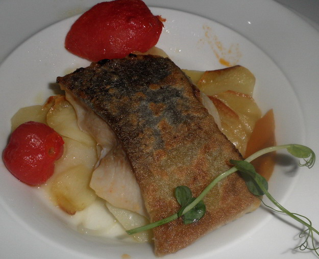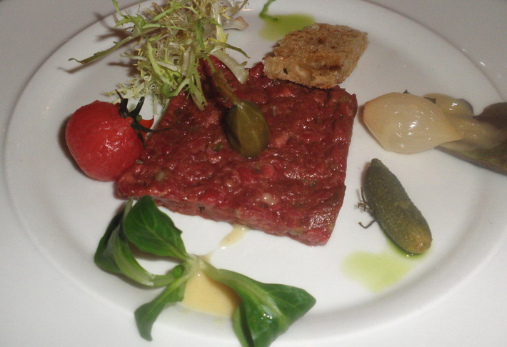 A marha tatár osztrák tafelspitz-ből készült, s úgy volt elkészítve, ahogy meggyőződésem szerint kell. Bár mindezt kimondani könnyű, azt is leszögezhetjük, hogy a tatár a legtöbb esetben nem így készül, amivel nemes húsrészekből végül nyers húspástétom, s mi egyéb készül a tatár helyett. A tányér ecetes illatú komponensei (gyöngyhagyma, uborka, kapribogyó) akár el is maradhattak volna, már csak azért is, mert a bor környezetében az ecetes ízt megjelenítése mindig igen kockázatos. A konfitált paradicsomnak ugyan nem vagyok nagy híve, mivel leginkább céltalan játszadozás eredményeképpen jelenik meg a tányéron, azonban itt okos helye, s szerepe (íze) volt.