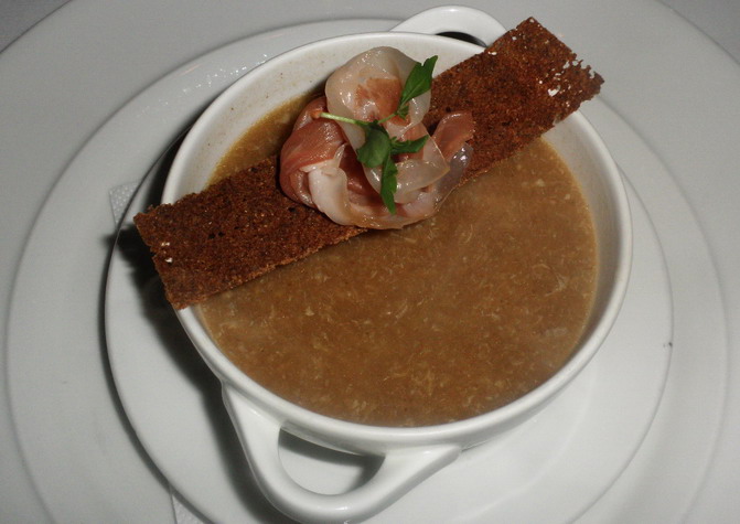 A vacsorára készült rántott leves a rántott levesek családjának archaizáló dél-német, osztrák alfaja (Einbrennsuppe). Sűrű, sötétbarna rántás, közepesen intenzív kömény íz, és szép simára eldolgozott tojás. A barna kenyér, s a mangalicasonka a leves gazdagítását szolgálta, bár akár az eredeti 19. század elejei stíluselemek is maradhattak volna felkockázott barnakenyérrel. Az azonban igaz, hogy így a leves elegánsabb benyomást keltett.