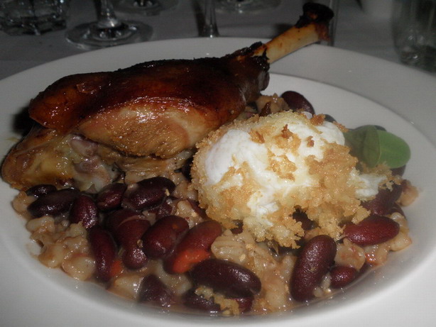 A liba Szent Márton madara, s persze Marsé ugyanúgy (Avis Martis), s Júnóé, a holdistennőé. A sólet pedig (gerslivel, vagy gersli nélkül) a libacombbal a legtermészetesebb szövetségben van (akárcsak a füstölt marhaszeggyel). A tojás ugyanígy elengedhetetlen a jó sólethez. Nos, Litauszki Zsolt, Kovács Árpád, s a többiek a konyhában a sólet lényegét jól értik, s okosan kombinálták a technikákat is, mert ha az ember nem a hagyományok szerint készíti, már pénteken kemencébe, sütőbe téve, akkor is lehet az jó, s sóletszerű, nem pedig gerslis babfőzelék libacombbal, tojással. Mindemellett a kidney bab helyett más fajta (tarkabab) talán előnyösebb lehetett volna, ahogy a gersli/bab arány is inkább a bab irányába fordulhatott volna több szaftossággal, ahogy az feltehetőleg megálmodásra került.