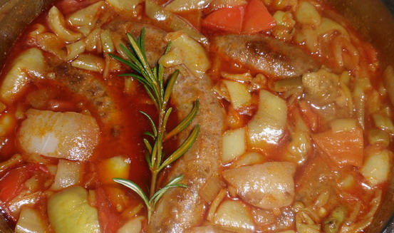 Az ételhez merguez kolbászt sütöttem serpenyőben, majd a megsült kolbászt a serpenyőben összegyűlt kevés kolbászzsírral egyeütt a lecsóhoz adtam, s néhány percg még együtt főztem őket. A lecsóhoz a rozmaring csupán az étel elkészülte után került, amikor már hűlt. Így éppen egy leheletnyi kellemes illatot, ízt kölcsönzött.