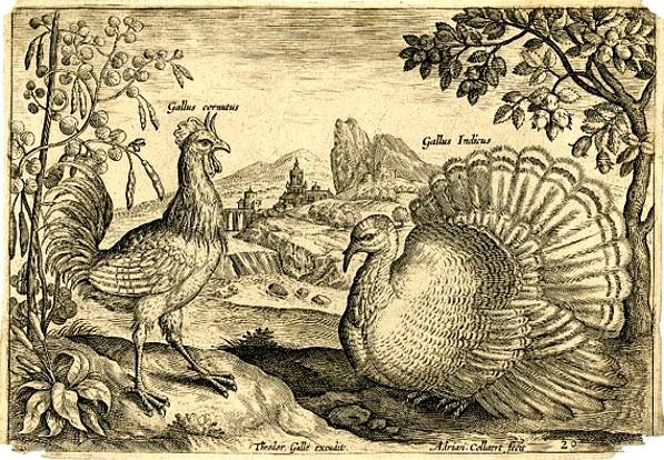 - Az indiai-kakas és indiai-tyúk (Indyay Tyk, 1581) elnevezés a latin Gallus indicus (Indiai-tyúk) név magyarra fordított változata, s nem valamiféle sajátos régi magyar elnevezés, ami bármit is igazolhatna. Németül (Indianische Hahn), s franciául (Le Coq d’Inde) is így nevezték Az alábbi képen Adriaen Collaert egy 1600-ból származó itáliai metszetén látható a Gallus indicus.
