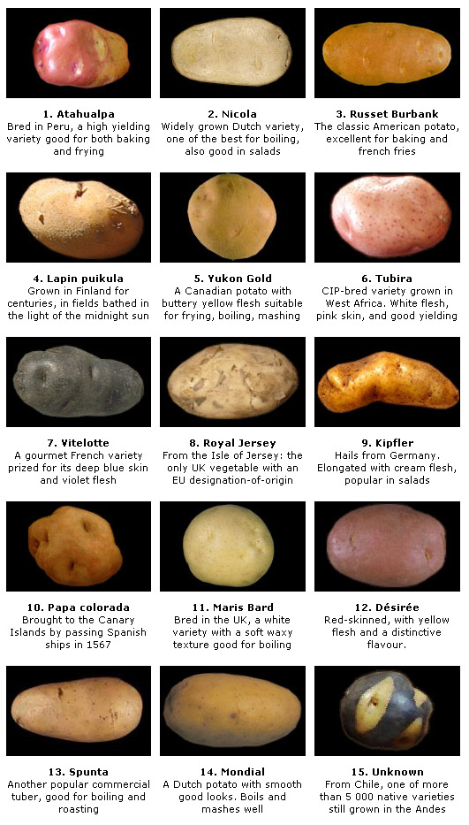 Csupán felvillantani szeretném azt a meglepő gazdagságot, ami a burgonyák változatosságát jellemzi, Az asztalunkra kerülő burgonyafajták csekély töredéke csupán a lehetőségek nagy számának.