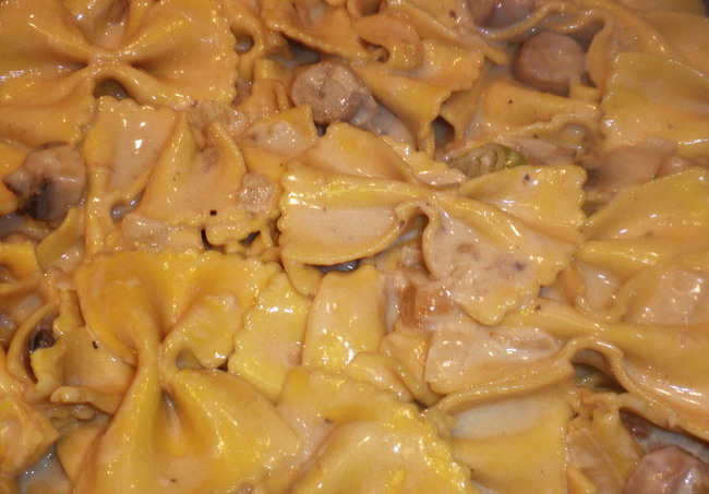A gombás mártáshoz adjuk az aznapi hangulatunk és a fellelhető választék alapján kiválasztott, bő vízben al dente megfőzött tésztát, és a tésztát, összekeverve a gombás mártással, 2-3 precig kis lángon együtt melegítjük. Ízesítjük, sózzuk, borsozzuk, ha szükséges.