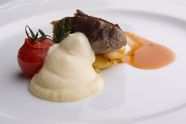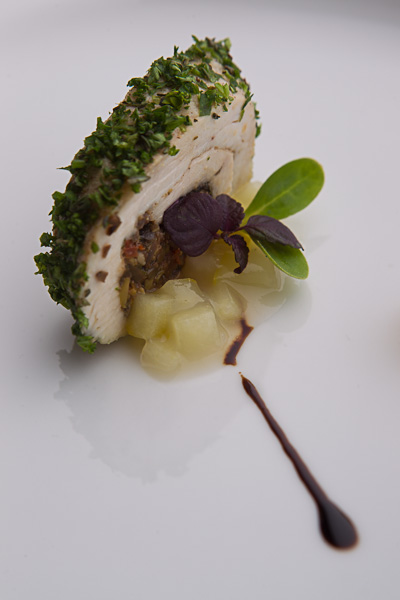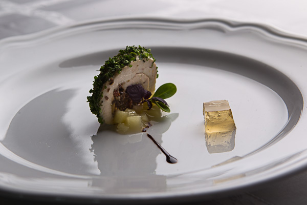 A füstölés bükkfaforgácsra helyezett kakukkfű és rozmaring füstjével történt. A rövid ideig pácolt jércemell barnacukorral, citrommal, kakukkfűvel, kevés fokhagymával, sóval fűszerezett, 80°C hőmérsékleten négy órán át készített paradicsommal volt töltve, s apróra vágott petrezselyem, kakukkfű, rozmaring keverékébe volt forgatva. Az ételhez agar-agar felhasználásával készült egy vaníliás almazselé is. Üde kompozíció, s üde ízek. Kellemes étel-bor pár.