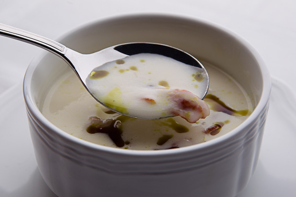 A levest tökmagolajjal és mangalicasonkával díszítve tálalták. A mangalica Magyarországon őshonos, védett sertésfajta. Zsírsertés, akárcsak neves rokona, a fekete ibériai fajta. A hazai sonkakészítési hagyományok némiképpen eltérnek a spanyoltól, így a magyar mangalica sonka is másként jó, mint az ibérico. A krémleveshez a szezonálisnak tekinthető tökmagolaj és sonka jól harmonizált.