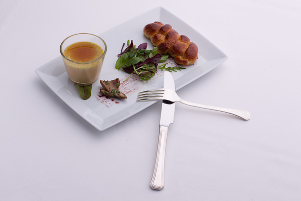 A rendezvény séfje ehhez a borhoz „Libamájpuding vargányás fonott kaláccsal” előételt választott. Az étel tányérjára ecsettel Cabernet sauvignon redukcióval festettek egy vonást. Vargányás fonott kalács, kevés saláta, fehér balzsamecettel marinált vargánya gomba szelet, s libamájpuding alkották az előételt. A libamájpudingot zsigerelt passzírozott libamájból tojással, pohárban hőkezelve készítették. A tetejére a libamájjal harmonizáló tokaji aszú redukció került. Az olvasztott vajjal megkent egyadagos meleg fonott kalács vargánya illata különösen tetszett, ahogy a libamáj textúrája és íze is. A Tűzkő Traminihez ez az előétel jó választásnak bizonyult. Ízletes előétel volt.