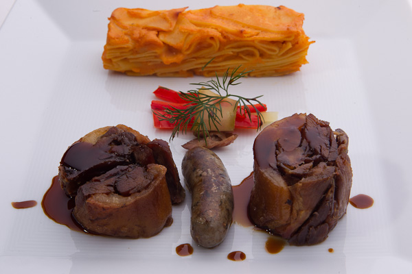 A bor mellé készített étel a „Kacsacomb házi májas hurkával, krumplis tésztával” nevet kapta, amivel többé-kevésbé meg is határozta az ételt. A kacsacomb zsírban abált (konfitált) kacsacomb volt. A zsírban abálás után a csontról lefejtett kacsahúst a felvágták, „percre pontosan” (á la minute) a szervírozás előtt még sütötték, s tálalták. A húshoz adott krumplis tészta jó elképzelés volt, s a paprika is illett a szekszárdi kékfrankoshoz, amely jól társul a magyar konyha hagyományos paprikás vonulatához is. Dupla méretű házi kockatésztát használtak hozzá. A krumplis tésztához is illően savanyú uborkacsíkból marinált paprikával készítettek „savanyúságot”. Mindehhez még házi májas hurka is volt. Illett a borhoz.