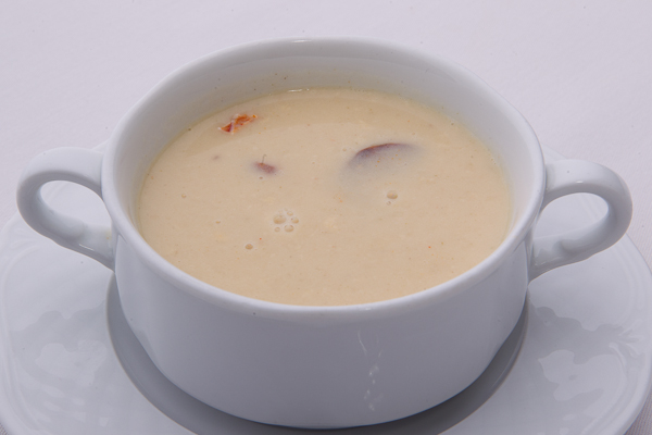 A krémleveshez jó minőségű csabai füstölt kolbász kerül a csészébe. A kolbász a maga fizikai valójában, mindenféle pirítás, sütés nélkül lett része az élménynek. Az Európát sokfelé jellemző burgonyából készített burgonyaleves és a paprikás magyar kolbász harmóniája akár szimbolikus is lehetne.