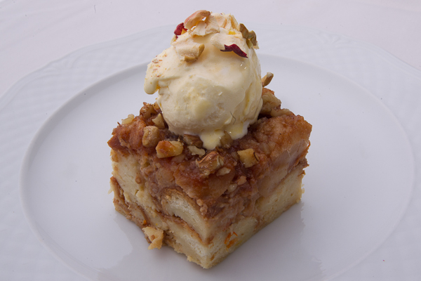 A borhoz álmodott, s persze el is készített desszert az „Almás-baracklekváros sült kalács, vanília fagylalttal” nevet kapta. A kalácsra durvára vágott mogyorót, diót tettek s rásütötték. A vanília fagylalt hideg hatása, s persze az íze is jól egészítette ki a meleg desszertet, s össze is simította a borral. Már a próbafőzésen is tetszett, és a borral édességben is harmonizáló fogás.