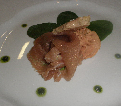 A füstölt tonhal ízét szeretem, s a libamájat is, melyet kétféle módon készítettek el. Az egyik féle elkészítés során a máj egy napig fűszeres, sós pácban áll, majd vákuum zacskóba került, amiben 90 percig 45°C hőmérsékletű vízfürdőben főtt. Ez a sous-vide (vákuum alatt), amelyet éppen a libamáj készítés során keletkező jelentős súlyveszteség elkerülésére alkalmaztak a francia séfek először, amúgy pedig a catering-ipar találmánya. A másik libamáj 60°C hőmérsékleten egy állítható hőmérsékletű, fűthető mixerben (Thermomix), kezdetben lassú fordulaton készült. A fűszerezéshez sót, borsot, sherryt, konyakot használtak. A májat ezután 37°C hőmérsékleten 8 percig keverték, majd teljes sebességen további 1 percig. Szép májkrém lett, amit kétféle, kukoricás és olívabogyós házi kenyérre kentem. A Rosé ma már a mindenhez jó borok kategóriájába csúszott át, ezért meg sem lephetett, hogy ehhez az ételhez is jó volt, bár az frizzante kis-ázsiai fűszeressége egzotikusabb volt az ételhez.