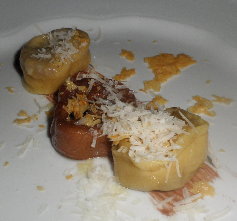 - A parmezán remek volt, sütve is, és frissen reszelve is megjelent (a sült parmezán még továbbfejleszthető lenne ennél az ételnél). Ha a redukciónak sok haszna nem is akadt, a tortellini borban megforgatásának annál több. Ízletes, jó étel volt, máskor is megenném. (A tálalás itt elnagyolódott.)