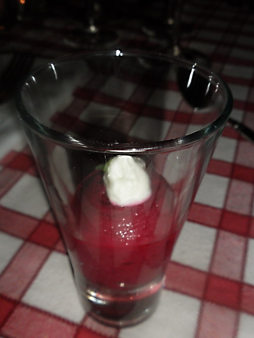 Sóban (són) sült céklát sóval, borssal, cseppnyi tejszínnel, balzsamecettel ízesítünk. Az est során találkozhattunk a sous-vide eljárással, a melegítéssel egyidejűleg végzett aprítással (Thermomix), s most a sorbet készítésénél megjelent a fagyasztott alapanyagokat aprító gép is (Pacojet). E misztikusnak gondolt készülékek mind ugyanannak a témának a különböző körüljárásai, s igen hasznosak a szakácsművészetben, mivel a főzés lényegét, a hőmérséklettel és az aprítással való szakszerű bánásmódot érintik. A Pacojettel különlegesen finom krémes, pürés, habos konzisztenciát állíthatunk elő. A cékla sorbet remek volt, s a cékla földes íze is szerencsésen háttérbe vonult.