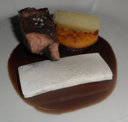 A téli zöldségek a cékla, a sütőtök és a feketegyökér voltak. A hús alá demi glace terült. Az elkészített húst a bordacsontokról lefejtették, majd a csontokat külön kezelték, mosták, szárították, s legvégül a tálalásnál a tányérra tették, mintegy jelzéseként annak, hogy az osztrák marha mely testtájáról is van szó. A hús Maldon sóval sózták. A demi glace mártás természetesen meghatározó ízt adott az ételnek, ez is volt a dolga, azonban ezzel magára is vállalta a borral való harmonizálás felelősségének nagy részét. A Solus 100% Merlot-ból készülő csúcsbor, csak dicsérni lehet ezt a forgalomba még nem került 2008-as bort is.