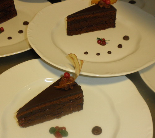 A Sacher torta ribizlivel készült. Karamell is akadt rajta. A csokoládé miatt a Cabernet franchoz jól illő desszert.