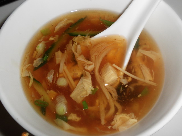 Az első fogás a hitünk szerint jól ismert édes-savanyú leves volt. Kevésbé édesen, és kevésbé savanyúan, leginkább pedig kevésbé sűrítve, mint azt a kínai éttermekben általában tapasztalhatjuk. Ha Wang neve, s híre nem hitelesíti, akkor megszokásaink, közhelyeink alapján még azt is gondolhattuk volna, hogy miféle leves ez? Az édes és savanyú egyébként klasszikus ízpárosítás volt az európai konyhában is. Népszerűsége különösen a középkorban volt nagy. A friss káposzta, újhagyma, uborka, chili, a szójaszósz remek, s frissítő hatású volt.