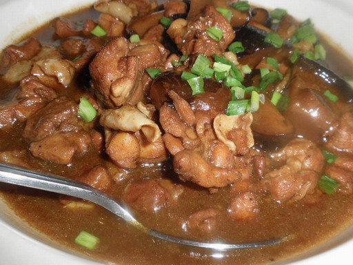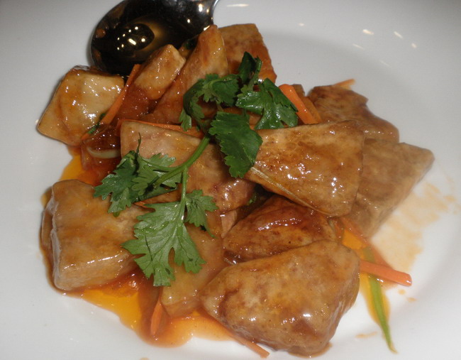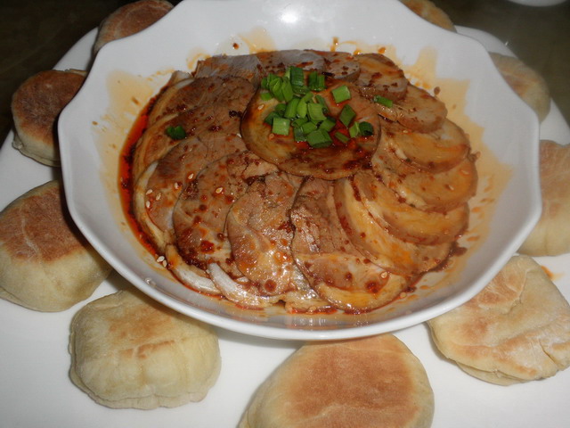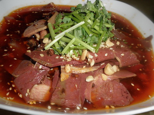 A következő fogás, a Kou shui feipan különösen gondolatébresztő volt. Marha szív, nyelv és pacal volt a tálban szezámmaggal, mogyoróval megszórva, korianderrel díszítve. (Ez az étel adta az ötletet, hogy néhány nappal később készítsek egy kacsa zúza, marhanyelv kombinációt.)