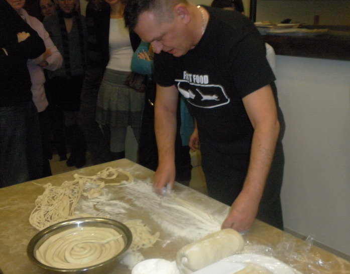 Az estnek ebben a szakaszában rövid tésztanyújtási, lapítási, készítési bemutató következett, ahol én is kipróbálhattam magam. (A kínai tészta titkáról korábban már írtam.) Elméletben ugyan minden lényegeset tudok a kínai tésztáról, ám a gyakorlat némiképpen más, amit a műveletet abbahagyva, összelisztezett nadrágomra pillantva is lemérhetem.