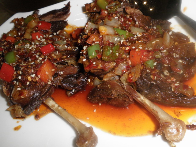Kacsacomb. A csont csupán dekoráció, a „mintha” kelléke, valójában falatokra volt bontva, hogy pálcikákkal is fogyasztható legyen.