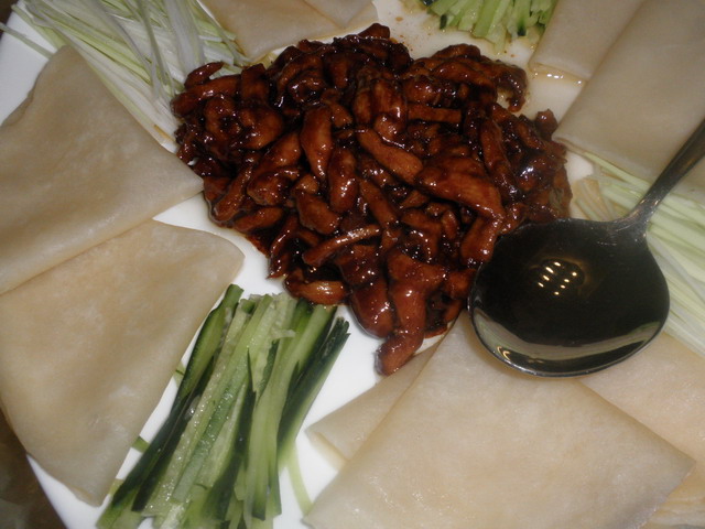 A következő étel a „Pekingi hagymás csirke” nevet kapta. Fogyasztásakor szétnyitott hüvelyk- és mutatóujjunkra helyezzük a tényéron pedánsan összehajtogatott lágy tésztát, s erre halmozzuk a csirkehúst, valamint a hosszába vékony csíkokra vágott friss ízű uborkát. A tésztát feltekerjük, a falatot jóízűen elfogyasztjuk.