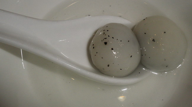 A vacsora desszertje „Darált szezámmaggal töltött tésztagombóc”. Kicsit rágógumis, nagyon egzotikus, mérsékelten édes, kipróbálásra érdemes, érdekes desszert.