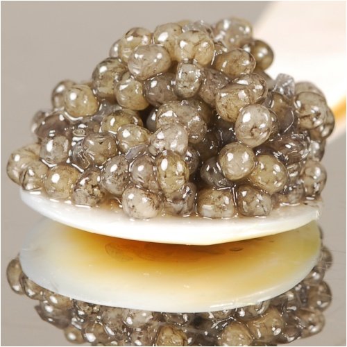 SEVRUGA: Akárcsak az előző fajok, ez is a Kaszpi- és a Fekete tengerben él. A sevruga (Acipenser stellatus) ikrája az előzőknél kisebb, 1,5-2,5 mm átmérőjű. Színe a világostól a sötétszürkéig terjed, enyhe barnás árnyaltokkal. Íze intenzív, zölddiós, és kesu zamatokkal, s bár ugyanannyi sóval készül, mint a beluga, a kisebb méret miatt mégis sósabb lesz. 100 g 55-65 ezer Ft. Végveszélyben lévő faj.