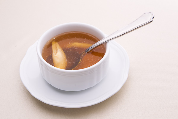 A Balaton környékének jellemző fehérjeforrása hajdanában a hal mellett a szárnyas volt. Ez a leves is póréhagymával, szárzellerrel zöldségelt szárnyas alaplé készítésével indult, majd ehhez darált marhahús került, ahogy az már az erőleveseknél klasszikusan megszokott. Tiszta, szép, koncentrált leves lett a végeredmény.