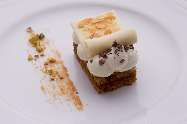 A borhoz „Mézes krémes” került. A grízes krém mellett törökméz, teával főzött birslekvár, mandula, fehér csokoládé is jutott a desszertbe, mely szerencsés módon visszafogottan édes maradt, ezért a friss ízű, almás, egreses, mézes, cseppet kesernyés bor mellett ragyogóan helytállt. A desszertbor és a desszert nem csupán az édességében egészítette ki egymást, ahogy az legtöbbször történik, hanem számos módon is harmonizált egymással.