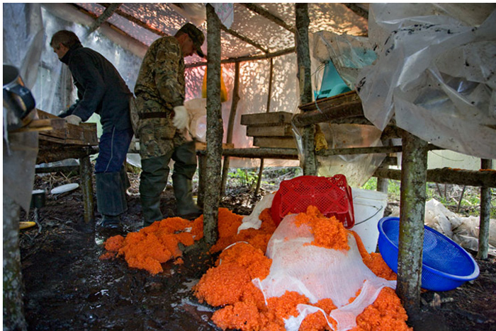 A lazac felmetszett hasüregéből begyűjtött értékes kaviárt ezután sózzák, majd konténerekben tengeri, vagy légi úton, a helybéliek szerint nem ritkán katonai szállító-repülőgépekkel juttatják el Oroszország európai területeire. Petropavlovszkban még 15 dollár a lazackaviár kilója. Ugyanez Moszkvában már a többszöröse. Ez mozgatja az üzletet, s ez sodorja a kipusztulás szélére a lazacokat, vele együtt a medvéket, s más fajokat.