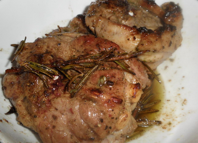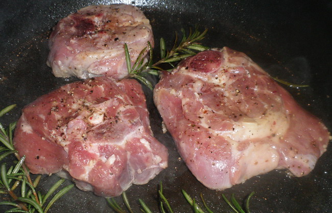 A felforrósított serpenyőbe kevés mogyoróolajat tettem, hozzáadtam a rozmaring ágakat, majd a vékonyan beolajozott hússzeleteket is, és a húsra borsot őröltem.