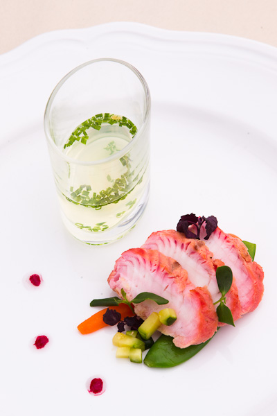 Ehhez az egyedi borhoz az előétel: „Céklával posírozott harcsa hagymazselével”. A posírozás kiváló és egészséges főzési eljárás az olyan gazdag húsú halak készítéséhez is, mint a hazánkban is őshonos európai harcsa (Silurus glanis), mely a Kárpát-medence folyó és állóvizeiben, így a Balatonban is gyakori. A halak készítéséhez régóta elterjedt csendes, gyöngyöző főzés (posírozás) ebben az esetben vákuum alatti (sous-vide) alacsony hőmérsékletű technológiával ötvöződik. A hal céklalében főtt meg, külső részein díszesen megszíneződve a főzőlétől. A színtelen hagymazselé pohárban kerül a hal mellé és a zselatinnal készült zselé ízét friss snidling tette tavasziassá. Hal, cékla, hagyma, snidling, s bébi zöldségek, színpompás, egészséges, ízletes összetevők.