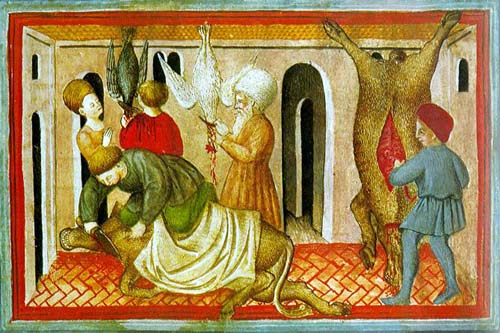 „De leginkább szükséges arra vigyázni, hogy az állatok agyon ne veressenek, és rútul ne rongáltassanak; ölésök előtt meg ne feszegessenek, hanem igen éles, jókora késsel, ne kicsinnyel, kit vér vétel előtt, a körmit alá s fel vivén rajta, megpróbáljon, hogy darabos csorbás élű ne legyen, mert úgy az állatokat megszaggatja és szaggatottnak tarttatik. És a madaraknak tollait is, egyéb állatoknak szőreit, gyapját eltisztítsa a metszőhelyen, kicsiny helyen, hol az első rontása keletkezik, mert jól elmegyen aztán rajta a jó éles kés. Vérét azután kibocsássa és megvárja annak jó kitakarodását, azután a darabolt húst mikor sütni, főzni készíti, darabos sóval a vértől megmossa.”