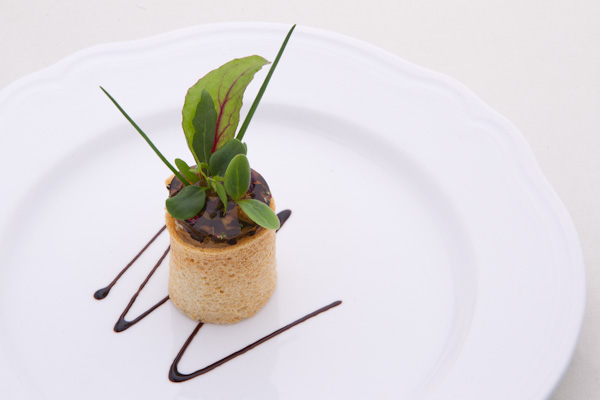 A borhoz az előétel: Fácán mousse erdei gombákkal. A fácán mousse (hab) alacsony hőmérsékleten (58°C) készített fácánhús, melyet finomra aprítottak, dijoni mustárral, tárkonnyal ízesítettek, s a tojással, tejszínnel elkészített fácán habot külön e célra sütött, szárított házikenyér hengerbe töltötték. Erre kerültek az erdei gombát, rózsaszirmot is magukba záró, enyhén bodzaillatos agar-agar korongok, majd a korongokra ötféle ízes, egészséges friss növény került, s nem csupán dekorációnak, a céklalevéltől, a hagymacsíráig, zsázsáig, vagy más néven nevezve, vizitormáig.