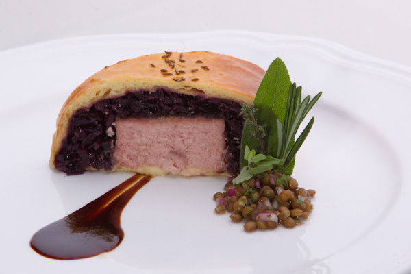 A borhoz komponált főétel Mangalica karaj burgonyás bélessel, vörös boros párolt káposztával. A mangalica Magyarországon is őshonos, s már a Magyar Nemzeti Múzeum alapításának idején, a 19. század elején is elterjedt volt. Ma már törvényileg is védett. Az étel mintha csak egy Wellington bélszín lenne, ám a formai hasonlóság mellett minden elemében akad eltérés, nem is kevés. A mangalica karajt 68°C-on 24 órán át készítették. Omlós, vaj puha lett. E köré vörös boros lilakáposztát, arra burgonyás tésztát rétegeztek, s egészben így sütötték meg. Tálaláskor szeletekre vágták, s hideg, hagymás, ecetes, főtt lencsével tálalták. Látványos, szép étel, változatos ízekkel. Az Etyeki Pinot noir 2006 legjobb tulajdonságait csalja elő. Érdemes volt elkészíteni. A jeles alkalomhoz méltó étel, egyszerre nemzetközi és magyar.