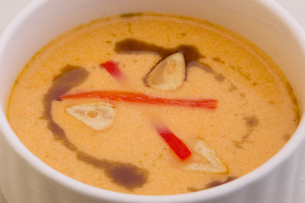 Az elkészült szép és behízelgő levesre a tálaláskor tökmagolaj, fokhagyma chips, és egy keskeny csík sült kápia paprika is jutott. Visszafogott, nőiesen elegáns, sima leves volt, forrón tálalva, jól eltalált sűrűséggel és tetszetős stílussal.