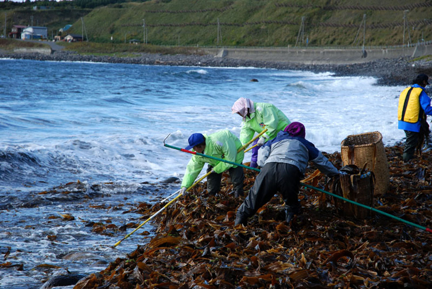 A tengeri algák, mint a konbu, szintán nagy mennyiségben tartalmazzák. A japánok éppen emiatt kedvelik ezeket a tengeri növényeket, amit szárított formában országszerte árusítanak. A konbu többek között a dashi nevű japán leves alapanyaga, amit szószokhoz, és más ételekhez is alapul használnak és változatosan készítenek. (A képen a japánban legjobbnak tartott Rishiri szigeti konbut gyűtjtik be.)