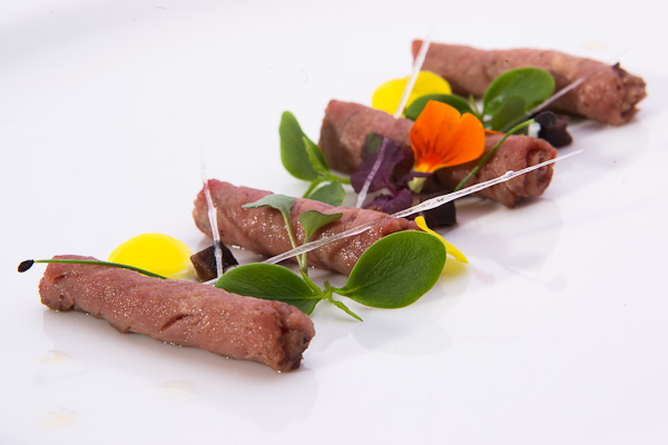 A borhoz készített előétel: Szürkemarha hátszín zölddióval. A szürkemarha hátszín 4 százalékos sóoldatban áll egy napig, majd leöblítették, hideg vízben áztatták, szárazra törölték, fűszerekkel pácolták, elősütötték, vákuum alatt (sous-vide) főzték, s közvetlenül a tálalás előtt újra kérgesítették, ügyelve, hogy a maghőmérséklet a szigorúan ellenőrzött előírásoknak megfelelő legyen. Az ilyen módon elkészült húst vékony szeletekre szelték, pürésített házi zölddióval kenték meg, majd felgöngyölték, tányérra tették, ehető, friss, üde növényekkel, s cukorszálakkal díszítették, egyszersmind ízesítették is. Falatnyi falatok, s összetett és munkaigényes készítési mód jellemezte ezt az előételt. A szürkemarha magyar fajta, mely továbbra is őrzi ősi jellegét. Hungarikum ez is, akárcsak a bor, a hozzá felszolgált kiváló ezerjó.