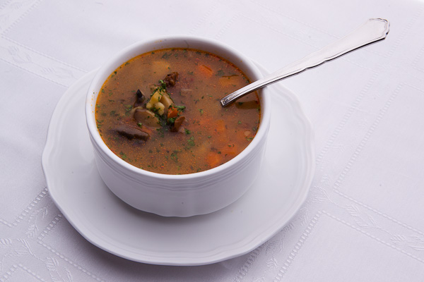 A hazai gombaleveseket azonban talán a gazdag zöldségelés és a tésztafélék, leggyakrabban a csipetke teszi felismerhetően mássá, bár az őrölt pirospaprika és a tejföl is éppígy része lehet. A díszvacsora gombalevese hazai szemmel hagyományosnak tekinthető módon, hagymaalappal indítva készült. Friss kakukkfűvel, sóval, borssal, fokhagymával, zöldpetrezselyemmel ízesítve került a csészékbe. Gombái a vargánya, rókagomba és tinóru voltak. A vacsora vendégei ezzel a gombalevessel a hazai ízvilágot jól tükröző, s ezzel sokak számára talán egzotikus levest kóstolhattak.