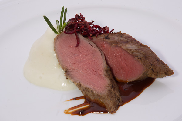 A kékfrankoshoz a főétel: Faszénen sült mangalica szűz szarvasgomba infúzióval, csicsókás burgonyahabbal, sült céklával. A mangalica, akárcsak a szürkemarha, a kívánatosnál csekélyebb számú hagyományos ősi fajtáink egyike. A mangalica szüzet faszén felett kérgesítették, majd 58°C maghőmérsékleten 60 percig készült, s tálalás előtt újabb kérgesítésen esett át. A csicsókás burgonyapüré tojássárgájával, bőséges vajjal, tejjel, tejszínnel készült, majd habszifonból lett a tányérra tálalva. A csicsóka különösen előnyére vált a burgonya „habnak”, lágyította, selymesítette is. A hús szép lett, s a puha ingredienciák mellé szerencsés választás volt a ropogós cékla chips. A hús alá szarvasgombával ízesített barnamártás terült. A kékfrankos kiválósága maga mellé emelte a főételt is, mely látszólagos egyszerűségével, s a mártás sokszínű összetettségével illett a borhoz leginkább.