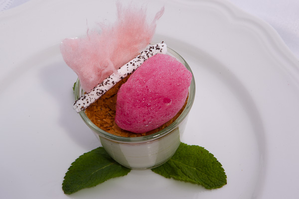 A pálinka desszertje, Fehérmák torta aszalt cigánymeggyel. A fehér mák, mint a tájfajtának tekinthető „Szentesi fehér mák” is, a kék mákhoz hasonló, azonban termése fehér, és kellemesen dió ízű. Igazi tavaszi termesztésű különlegesség. Az üvegpohárban tálalt fehérmák „torta” alapja egy tejjel, tejszínnel, kókusztejjel, fehérmákkal, cukorral, zselatinnal készített panna cotta. Erre az alapra szezámmag és aszalt cigánymeggy rétegződik, majd újabb panna cotta réteg épül rá. A desszert tetején ropogós, szárított palacsintatészta, lecitinnel habosított cigánymeggyhab, tojásfehérjéből cukorsziruppal készített hosszúkás „habcsók” (meringue italienne) és vattacukor. Összetett, komplex ízvilág. Az édes legkülönbözőbb fokozatai keverednek a ropogóstól a habos-levegősig terjedő selymes érzetekkel.