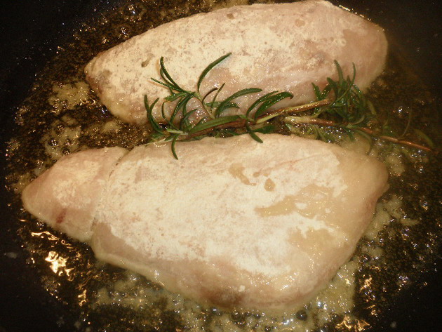 A Nílusi sügért lisztben megforgattam, serpenyőben kevés felforrósított olajra tettem, mellédobtam két rozmaring ágat és a halszeleteket sütni kezdtem. A végén sóztam.