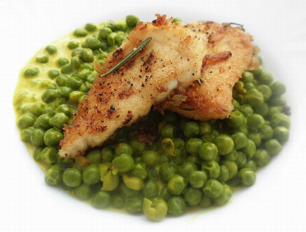 A főzelékeket általában vajjal való párolással kezdem, s csak később adok hozzá kevés vizet, több tejfölt, tejszínt. Ezúttal kevés, a zöldborsót el sem lepő mennyiségű vízzel kezdtem a zöldborsó főzését, majd öt perc elteltével, kurkumát, fekete borsot, chilit, rozmaringot adtam hozzá, valamint a sűrítés kedvéért is, ízlés szerint krémsajtot. (Ez el is maradhat, ám akkor bőségesebb kurkumát és koriandert is javaslok. Mindkettő nagyon egészséges.) Az ételt a végén sózzuk. A főzelékhez a sült hal társult: