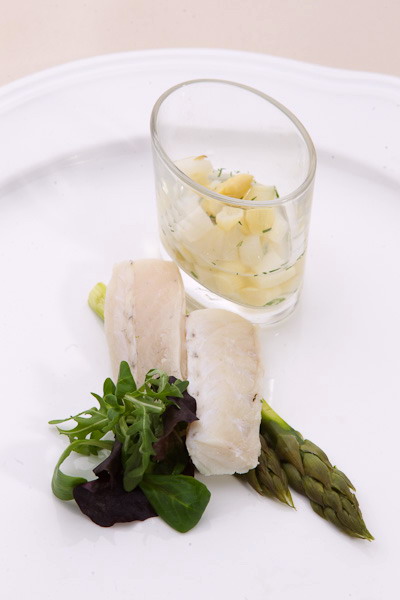 A bor mellé az előétel: Balatoni fogasfilé füstölt zöldspárgával és spárgakompóttal. A fogast szárzellerrel, kaporral, citrommal, sóval, csipetnyi cukorral ízesítve posírozták, vagyis gyöngyöztetve, kíméletesen főzték. A zöldspárgát tisztították, forrázták, cseresznyefa forgácson házilag füstölték. A spárgakompót sóval, cukorral, kaporral ízesített „kompót” lében készült és a mai trendeknek megfelelően pohárban tálalták. Az előételhez többféle saláta is került.