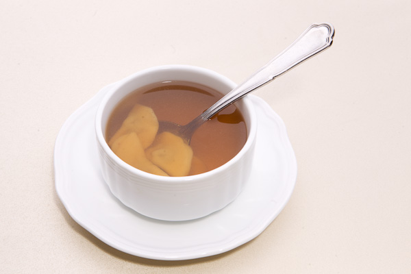 2) A leves: Racka erőleves, bárányhússal töltött derelyével.