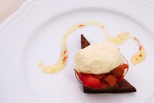 A rebarbarát tisztították darabolták és vaníliás cukorszirupban rövid ideig főzték. Az epret felszeletelték. A tányérra csokoládés Eszterházy tortalap került, erre egy cukorból (izomaltóz) készült kosárka. A kosárba került az eper, a rebarbara és a sáfrányos mézhab. A sáfrányos mézhab (mousse) felfőzött tojássárgájával, cukorral, mézzel, olvasztott fehér csokoládéval, belefőzött sáfránnyal, felvert habtejszínnel készült.