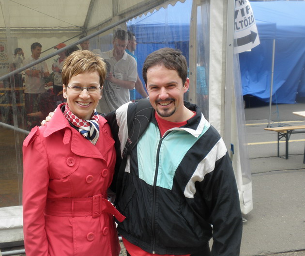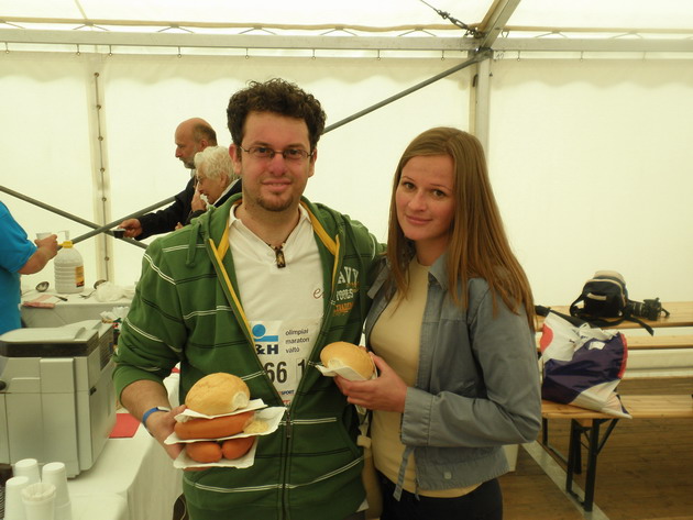Bakos Piroska és Dr.Urkuti György, aki ekkor már lefutotta a hét kilométert. Ideje 32 perc 28 másodperc volt, ami 13 km/óra átlagsebességnek felel meg – hét kilométeren keresztül.